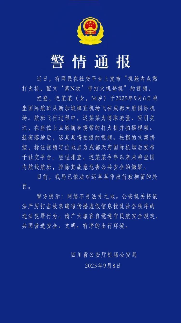 9月8日,四川省公安厅机场公安局发布警情通报:警情通报近日,有网民在社交平台上发布“机舱内点燃打火机,配文‘第N次’带打火机登机”的视频。经查,迟某某(女,34岁)于2025年9月6日乘坐国际航班从新加坡樟宜机场飞往成都天府国际机场。航班飞行过程中,迟某某为博取流量、吸引关注,在座位上点燃随身携带的打火机并拍摄视频。航班落地后,迟某某将拍摄的视频、杜撰的文案拼接,标注视频定位地点为成都天府国际机场后发布于社交平台。经过排查,迟某某今年以来未乘坐国内航线航班,排除其故意危害公共安全的嫌疑。目前,我局已依法对迟某某作出行政拘留的处罚。四川省公安厅机场公安局2025年9月8日